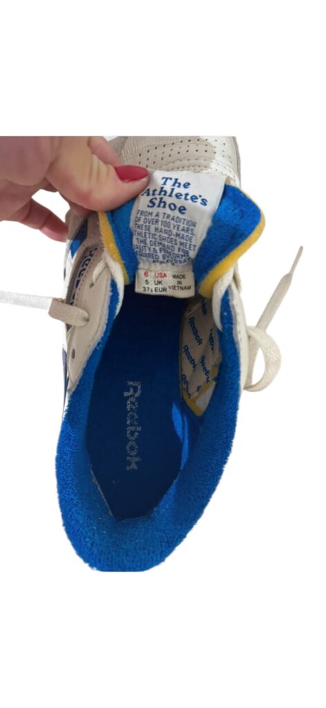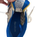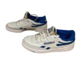 Baskets Reebok basses en cuir blanc avec détails bleus.