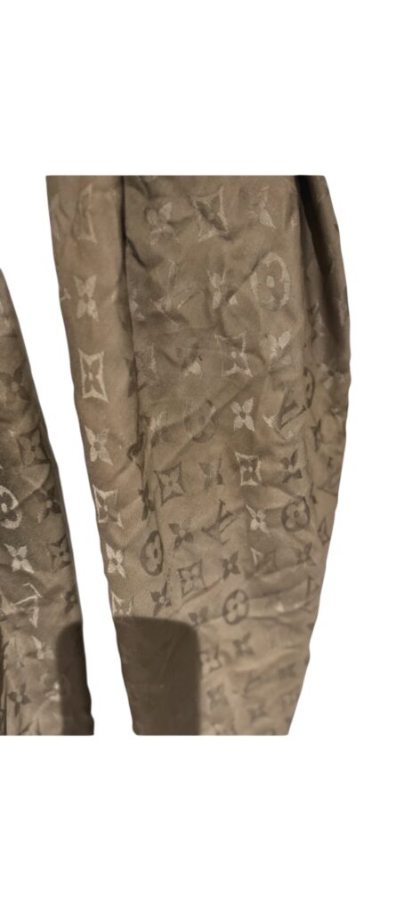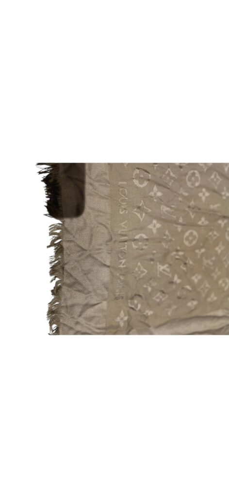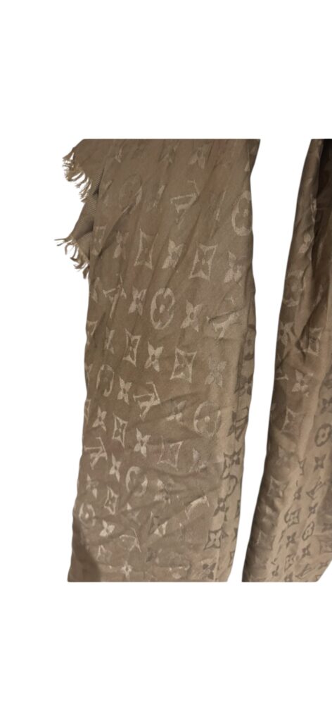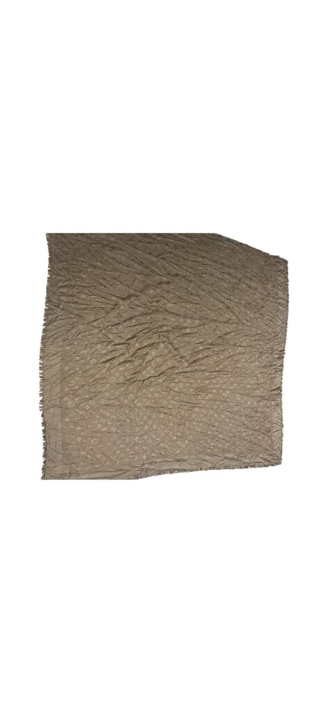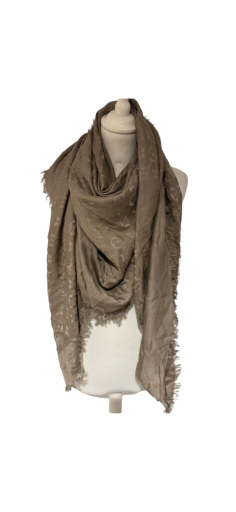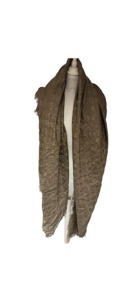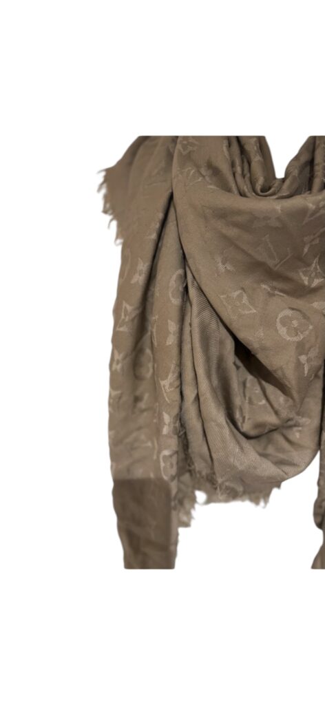 Magnifique étole Louis Vuitton Monogram, dans un élégant ton taupe/beige, facile à associer toute l’année.