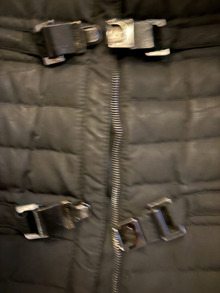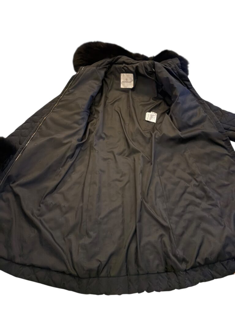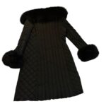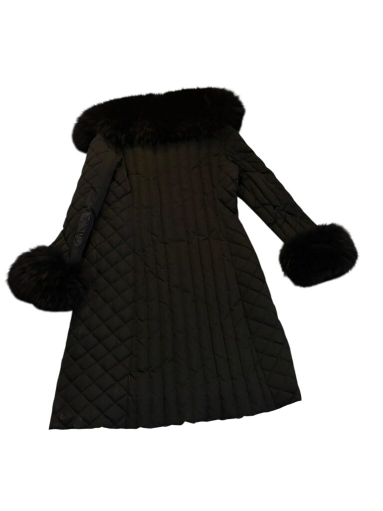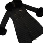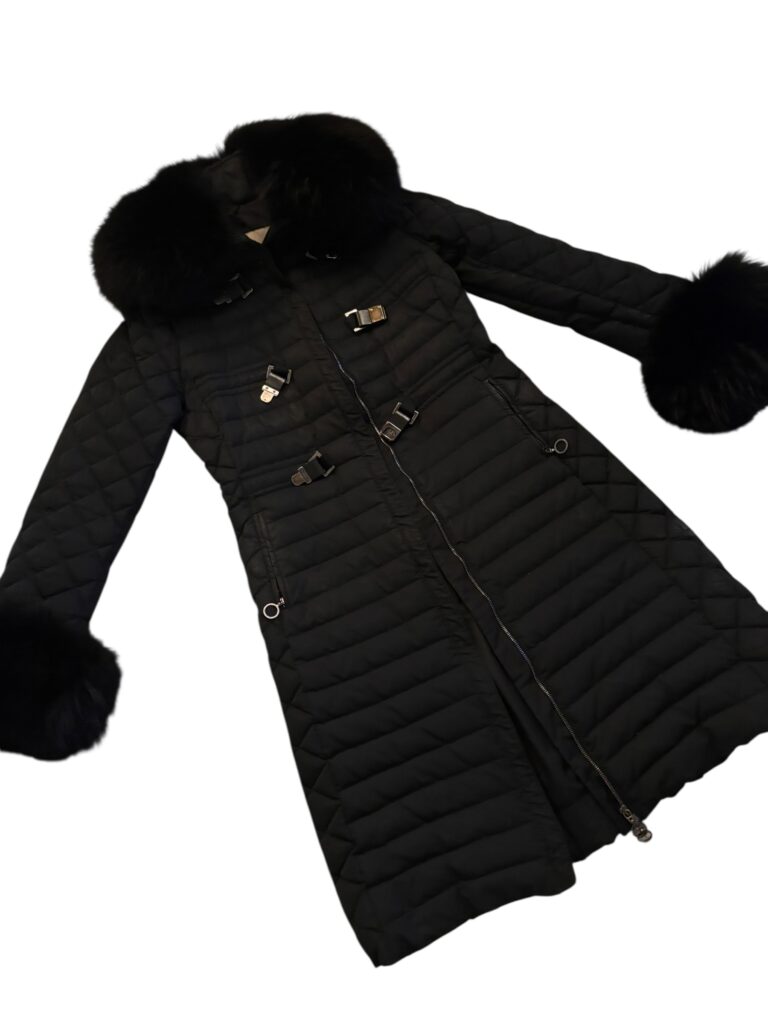 Coupe féminine et structurée, matelassage soigné, capuche bordée de fourrure, poignets en fourrure amovibles, fermetures zippées et détails de boucles métalliques à l’avant qui signent une pièce forte et sophistiquée.