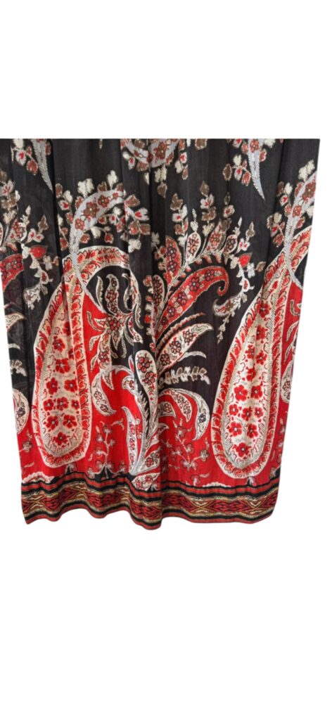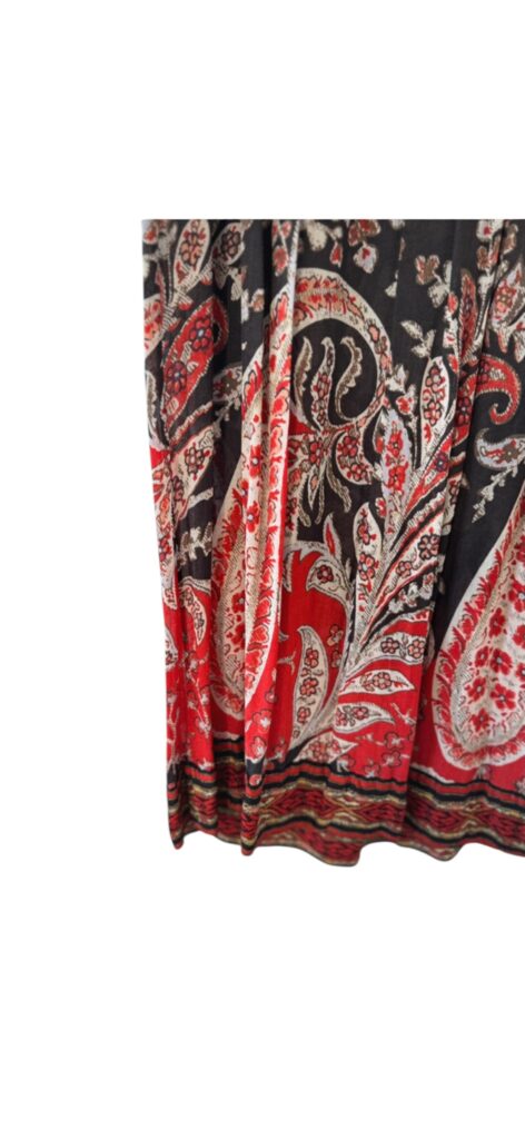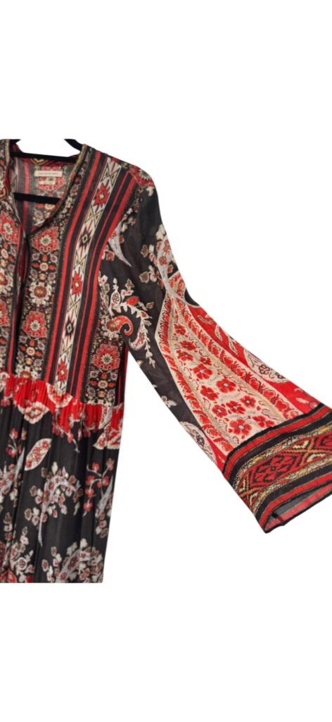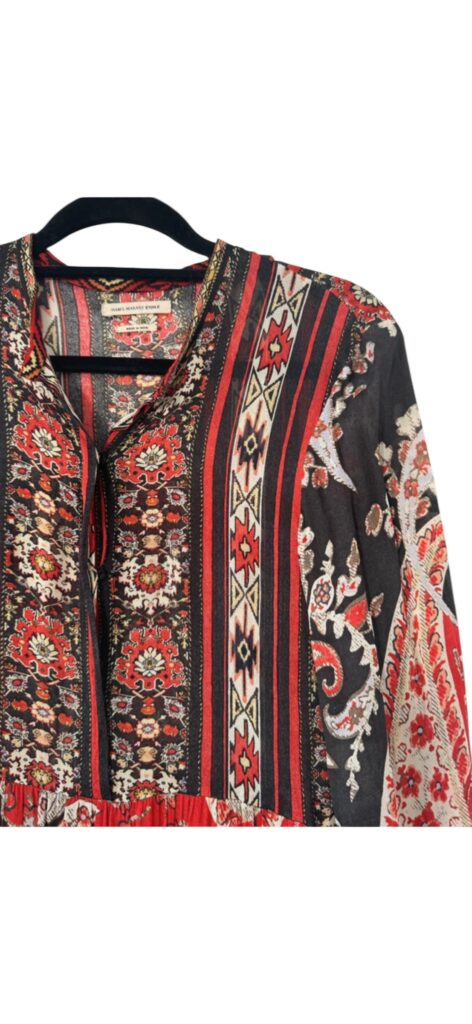 Magnifique robe Isabel Marant Étoile à l’esprit bohème chic, avec un sublime imprimé ethnique dans des tons rouge, noir et écru.