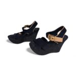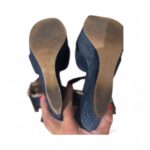 Fabriquées en février 2012 (code : NL 0122), ces sandales présentent un talon compensé d’environ 10 cm, adouci par une plateforme avant de 2,5 cm, offrant une hauteur ressentie très confortable.