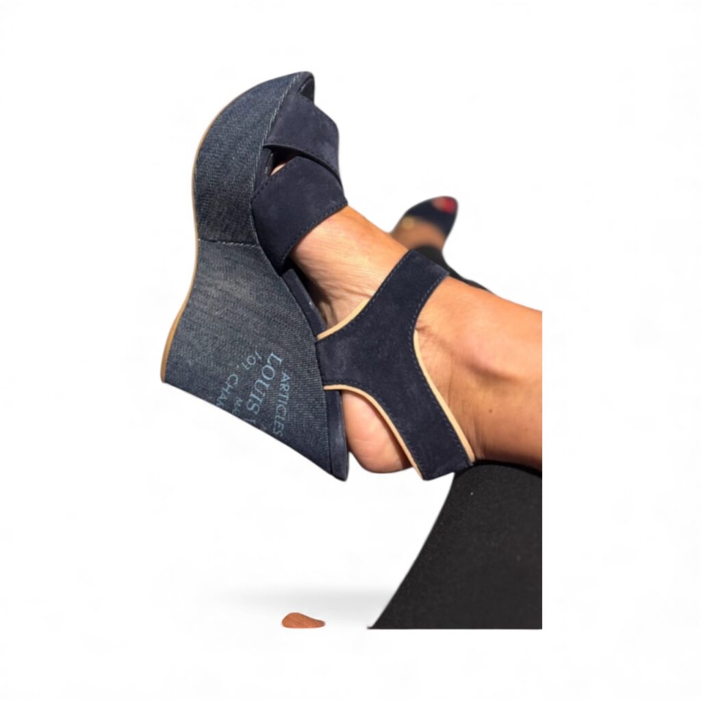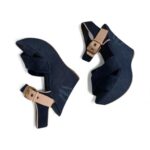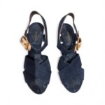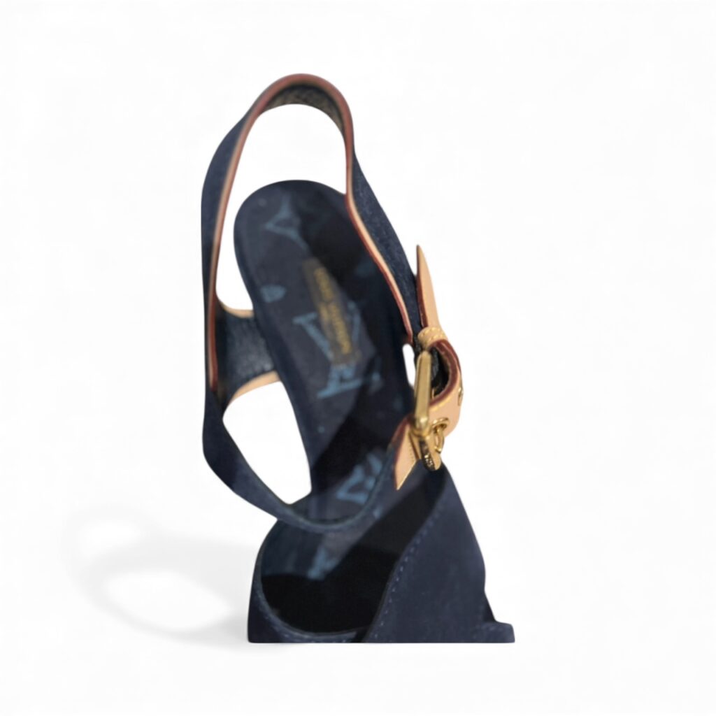 Leur silhouette est habillée d’un denim bleu profond orné d’inscriptions Louis Vuitton, associé à une empeigne en nubuck bleu nuit qui apporte douceur et élégance au pied. La semelle intérieure reprend le monogramme emblématique LV, tandis que la bride est sublimée d’une boucle dorée signature, donnant à ce modèle un charme résolument sophistiqué.