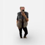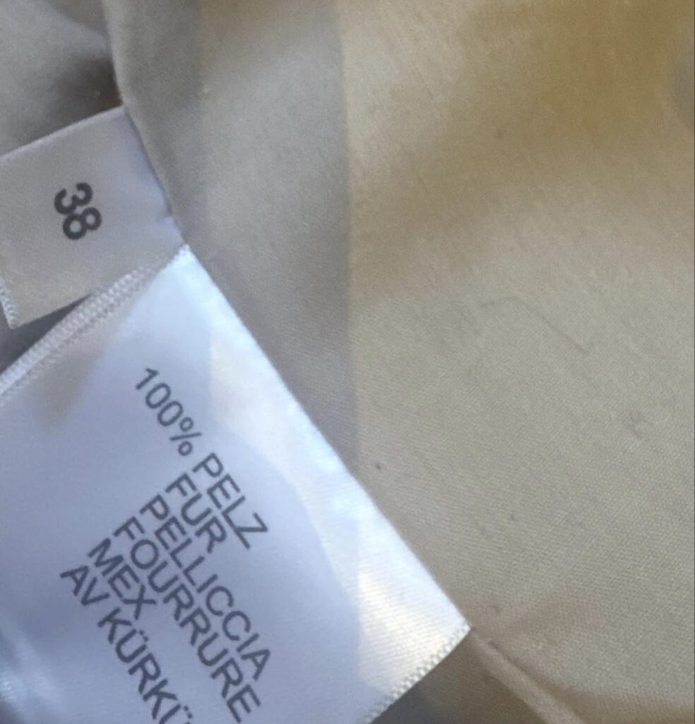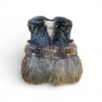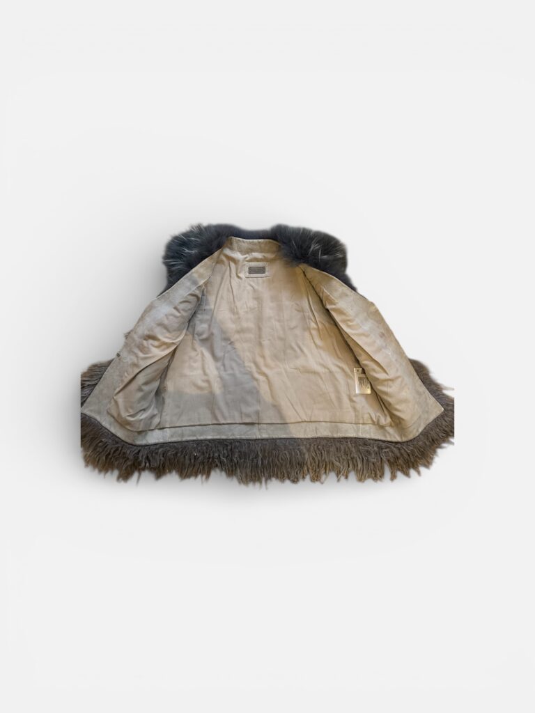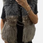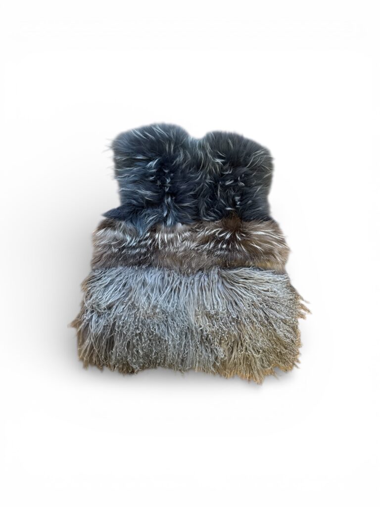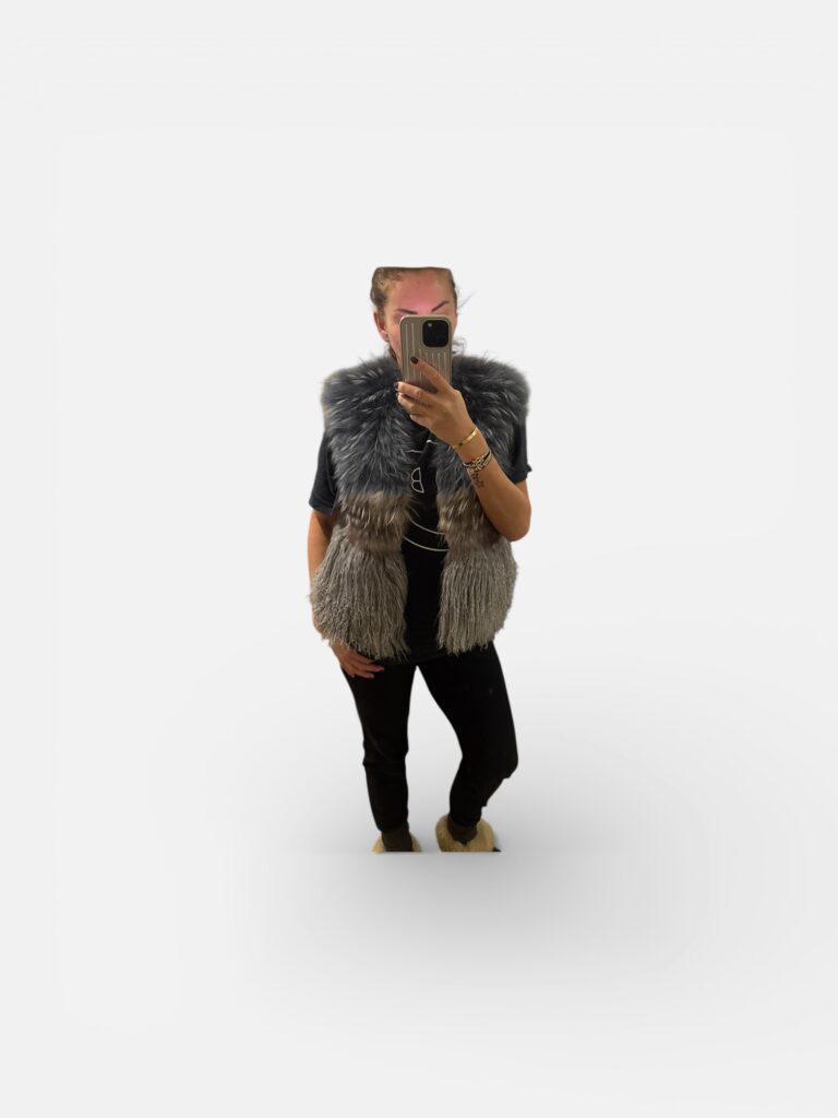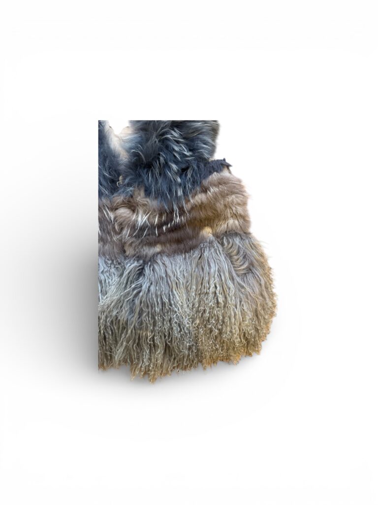Magnifique gilet sans manches en fourrures véritables assemblées, aux nuances de gris, bleu acier et taupe.