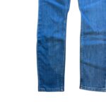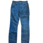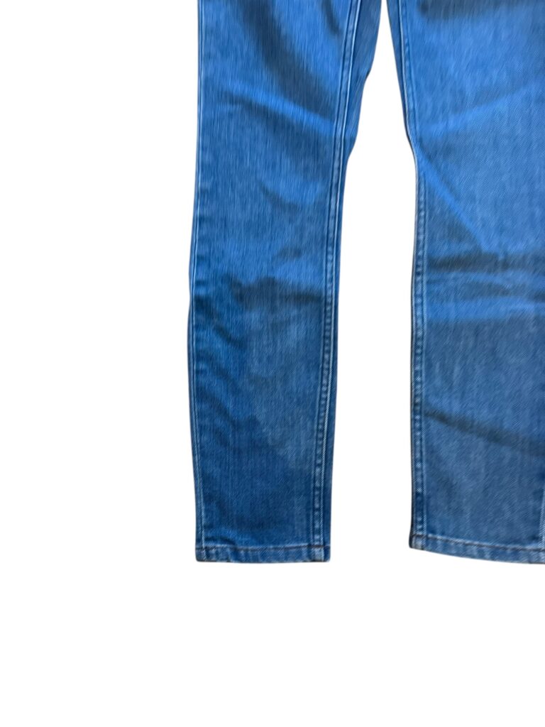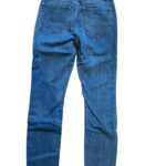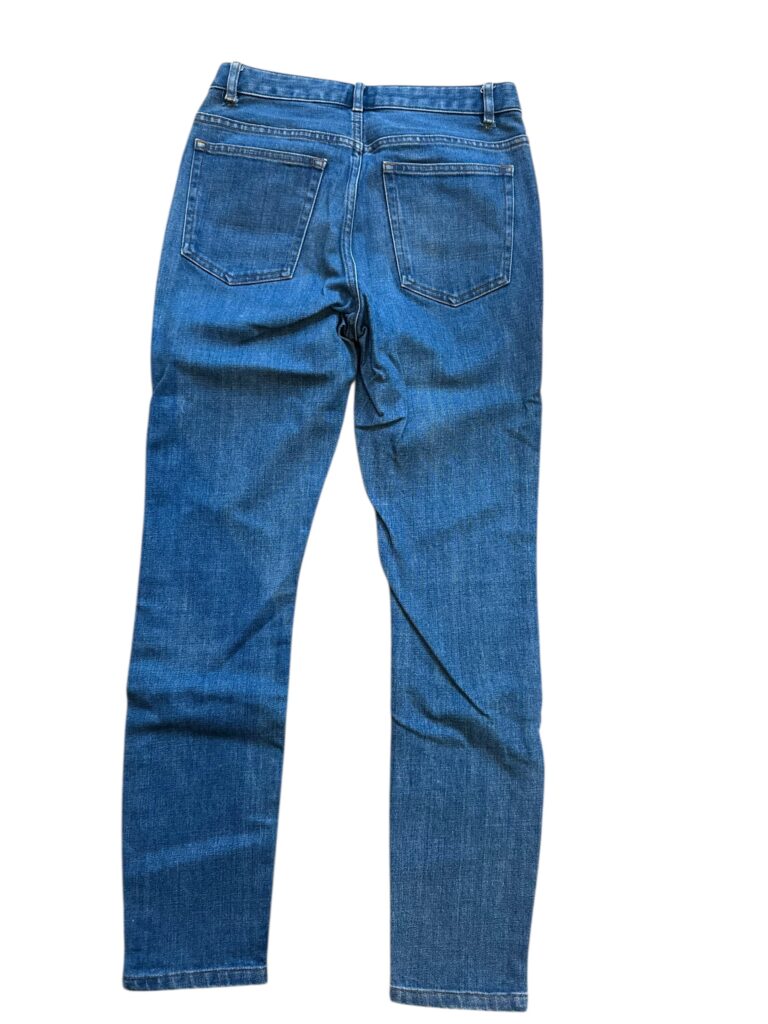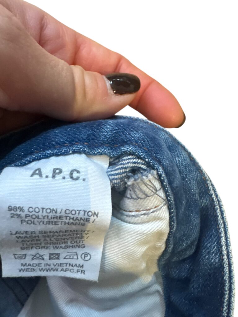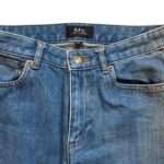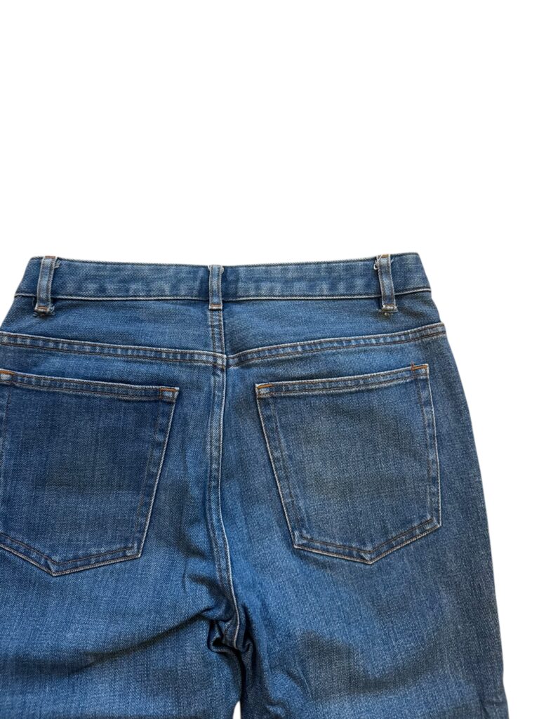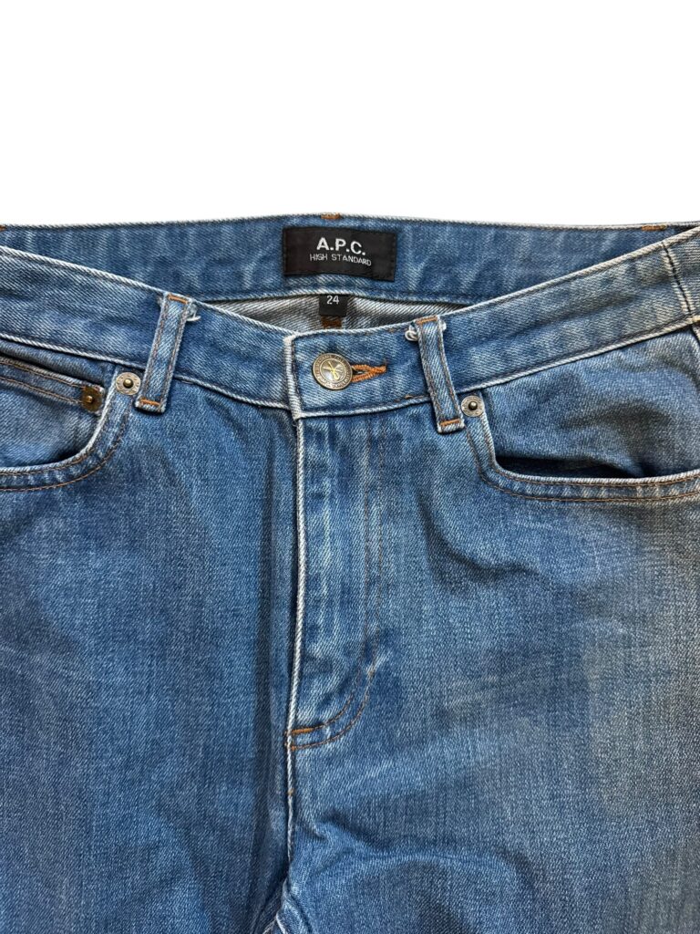 A.P.C. High Standard en denim bleu moyen. Coupe slim droite, taille mi-haute, fermeture zippée et bouton gravé.
