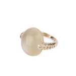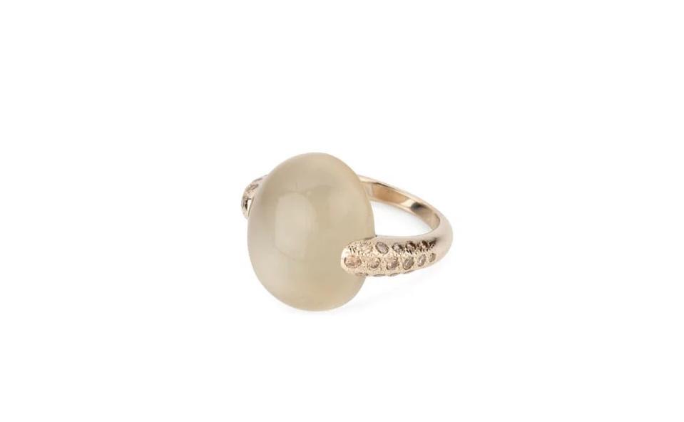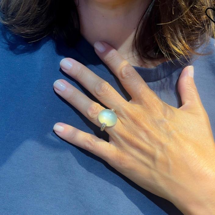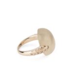 Icône de modernité et de raffinement, la bague Luna de Pomellato séduit par ses lignes généreuses et son allure sculpturale. Son imposant cabochon ovale en calcédoine, à la douceur laiteuse, est délicatement sublimé par un pavage de diamants bruns qui apportent chaleur et profondeur. Une pièce de caractère, à la fois précieuse et résolument contemporaine.