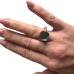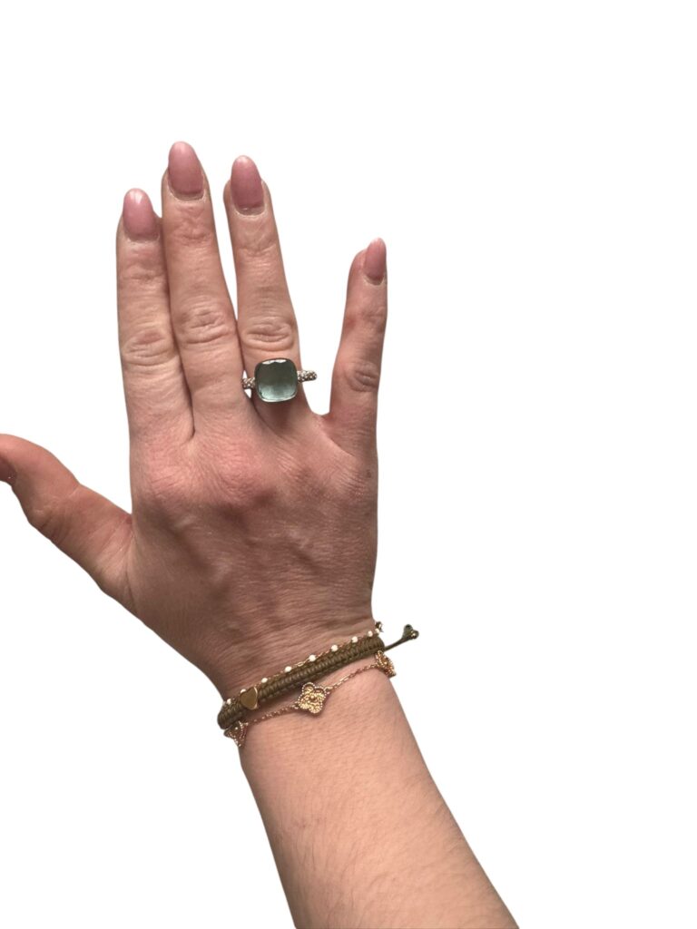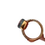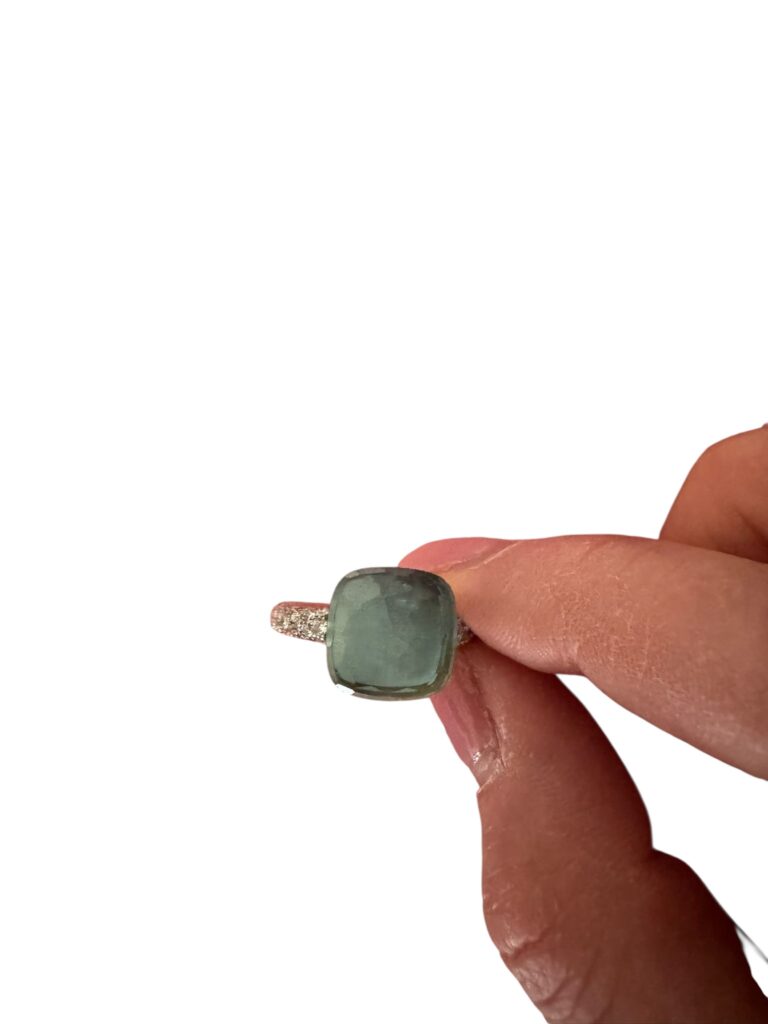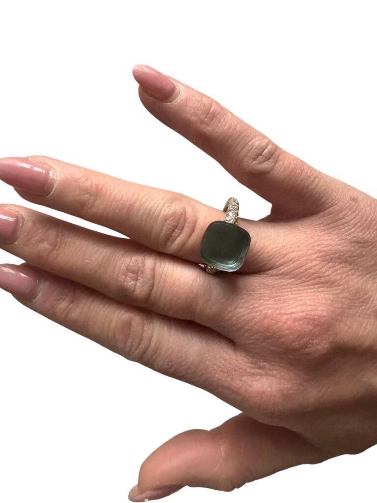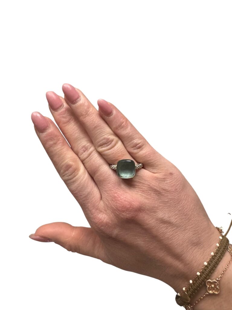 Superbe bague Pomellato, modèle iconique Nudo, en or sertie d’une pierre centrale facettée vert d’eau et d’un pavage de diamants.