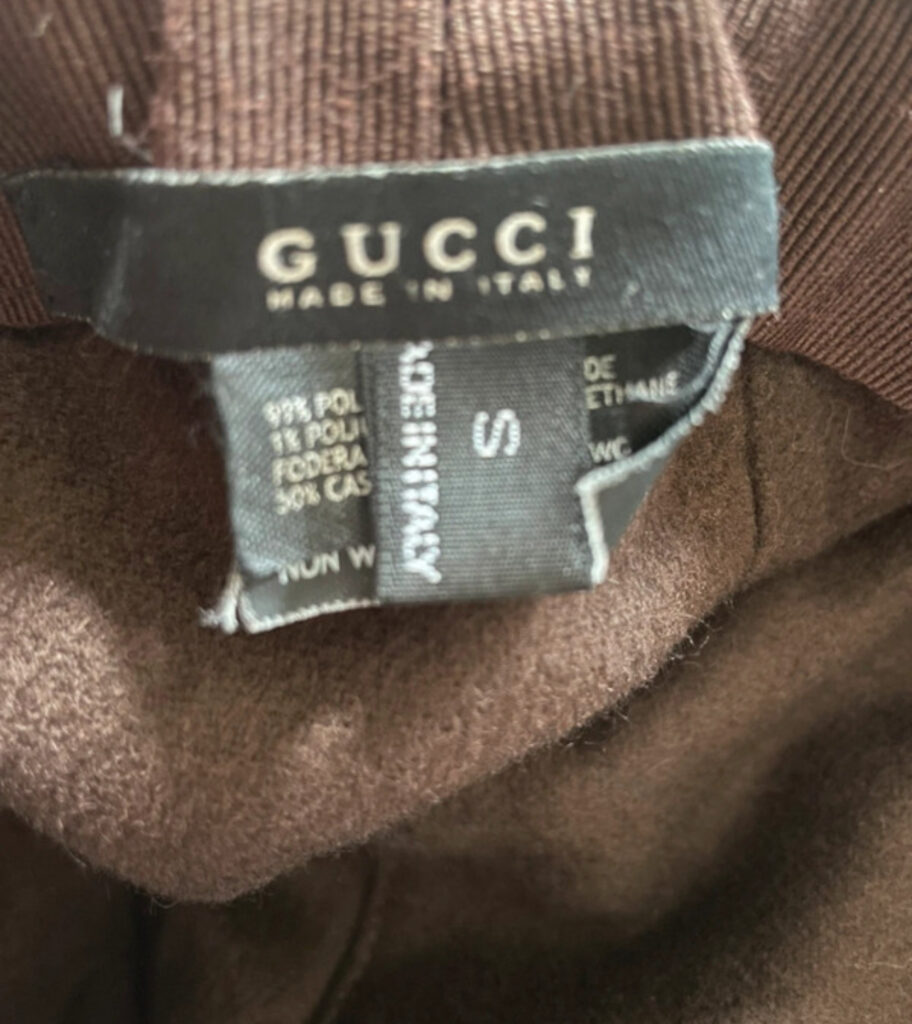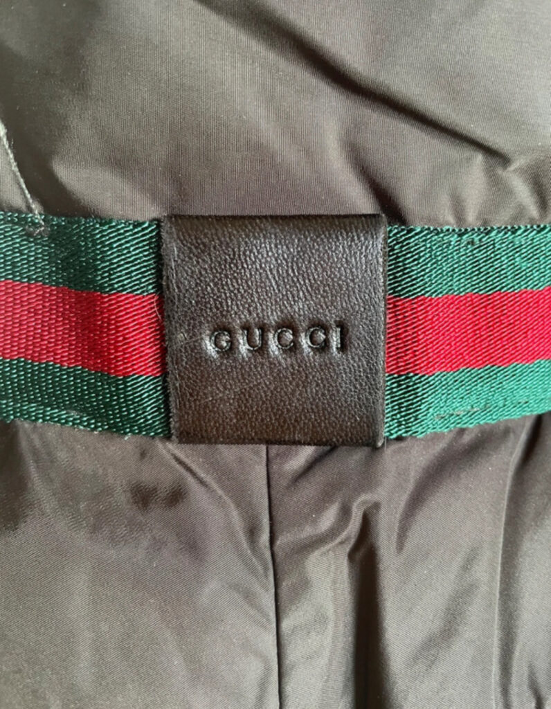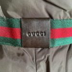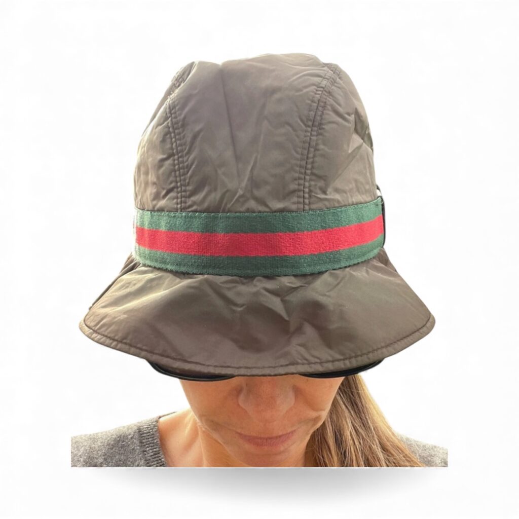 Magnifique bob Gucci authentique, en nylon kaki/marron au fini froissé, orné de la bande Web verte et rouge emblématique de la Maison. Logo Gucci embossé sur une pastille en cuir.