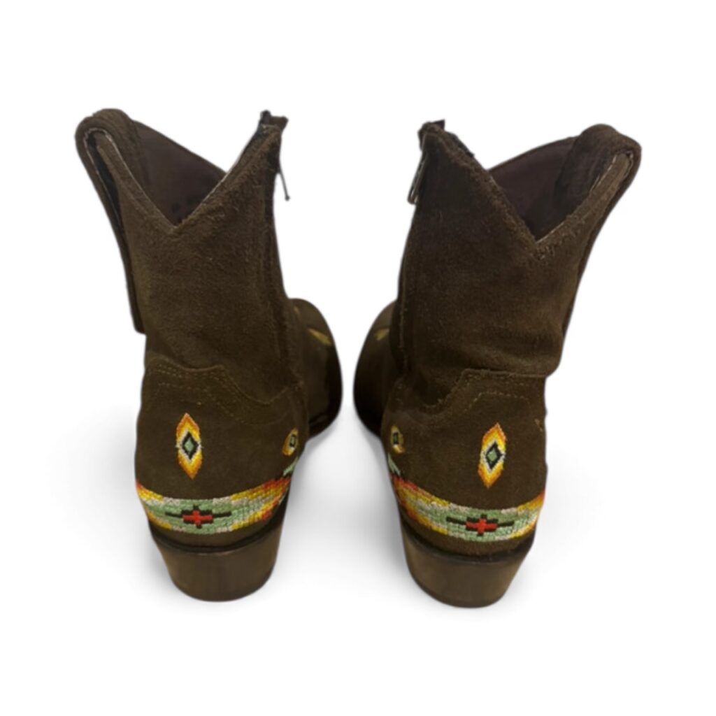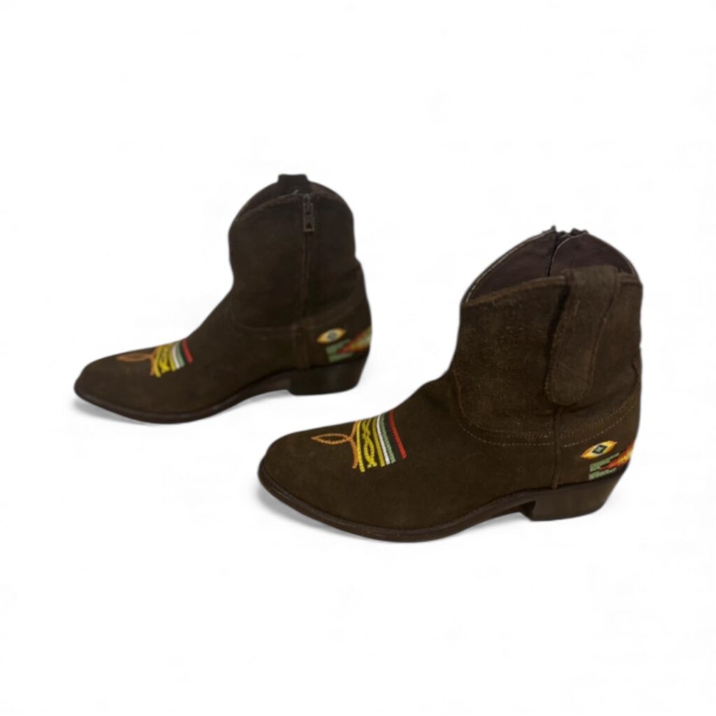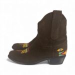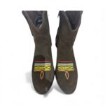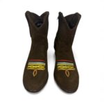 Magnifiques bottes Mexicana en daim marron, décorées de superbes broderies artisanales multicolores à inspiration mexicaine sur l’avant et à l’arrière.