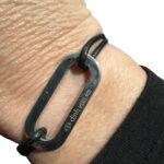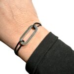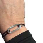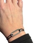 Bracelet Dinh Van Paris en argent massif 925, composé d’un maillon allongé rectangulaire gravé dinh van 925, monté sur un cordon en cuir noir ajustable.