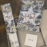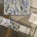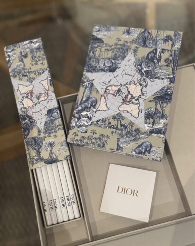 Édition élégante avec illustrations raffinées façon toile de Jouy et motifs Dior, contenant de jolis crayons et carnets assortis.