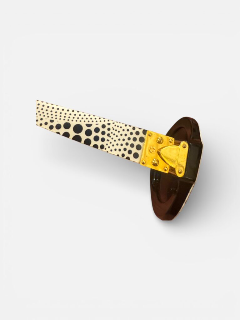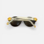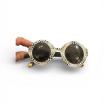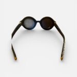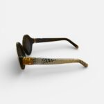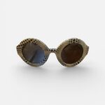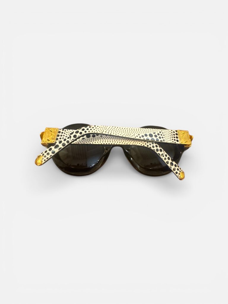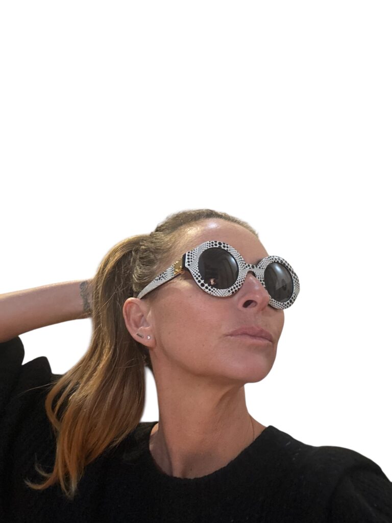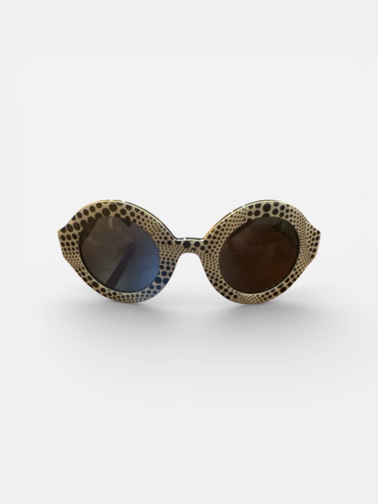 Monture ronde en acétate avec imprimé pois noirs sur fond écru, signature graphique très couture.