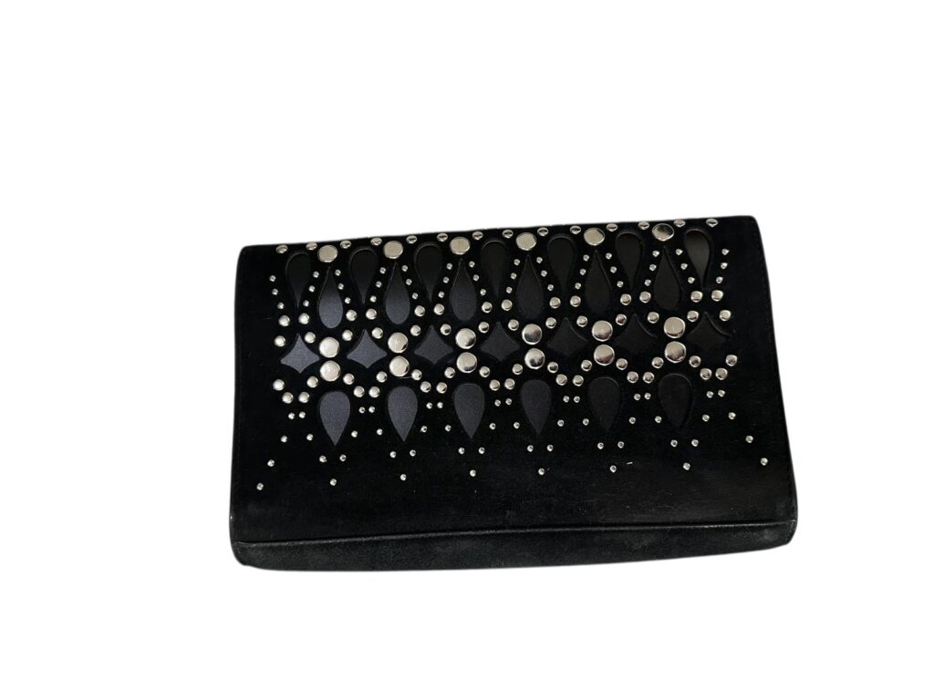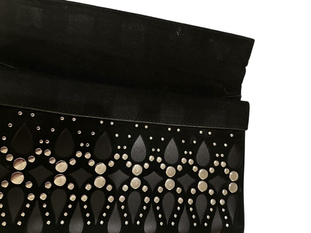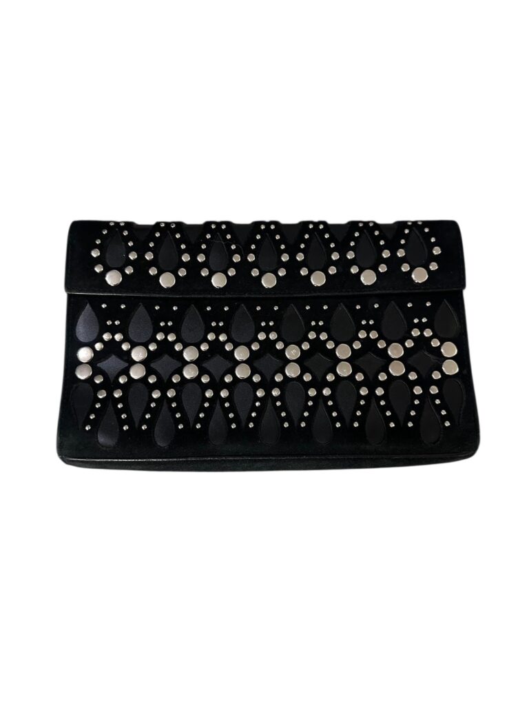 Pochette Alaïa noire en cuir découpé laser et clouté – Très bon état