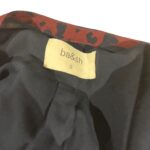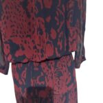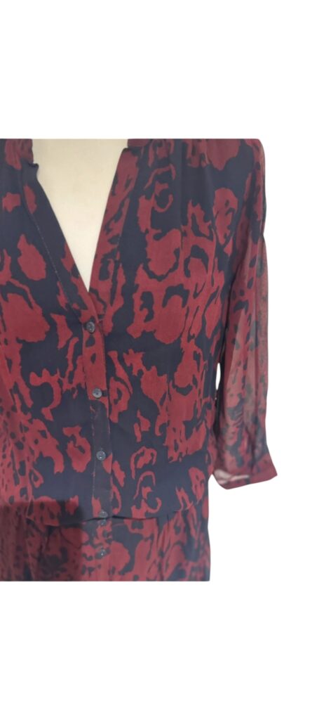 Imprimé noir et bordeaux, manches 3/4 légèrement transparentes, col en V boutonné.