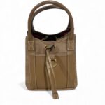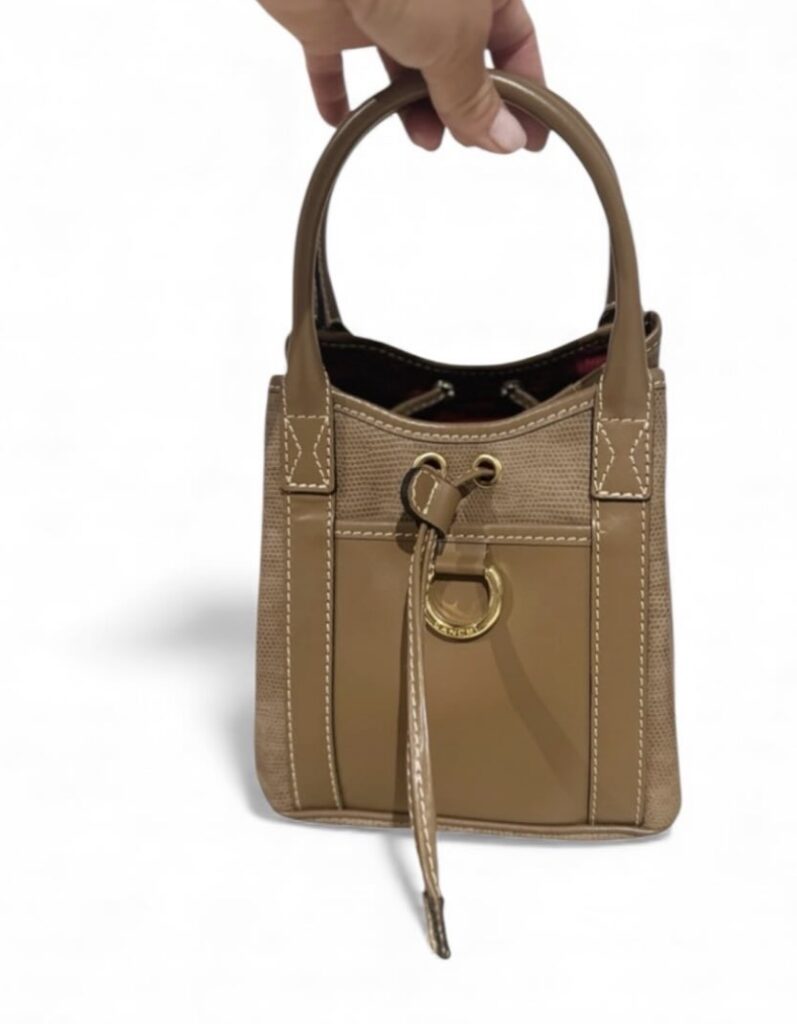 Charmant mini sac Lancel en cuir lisse et cuir texturé façon lézard, dans une teinte marron/camel très élégante. Modèle seau structuré, doté d’un lien coulissant avec œillets dorés et d’un anneau décoratif signature Lancel à l’avant. Intérieur en tissu bordeaux entièrement siglé Lancel.