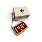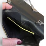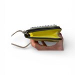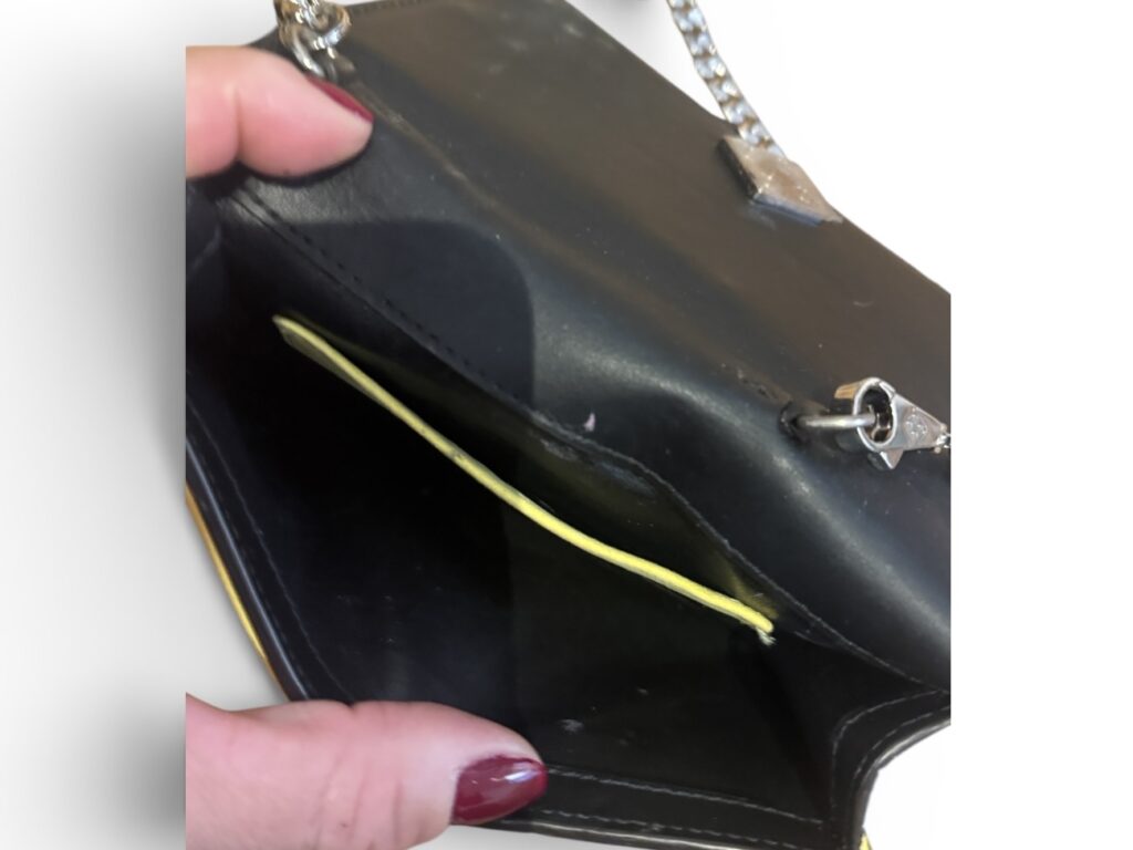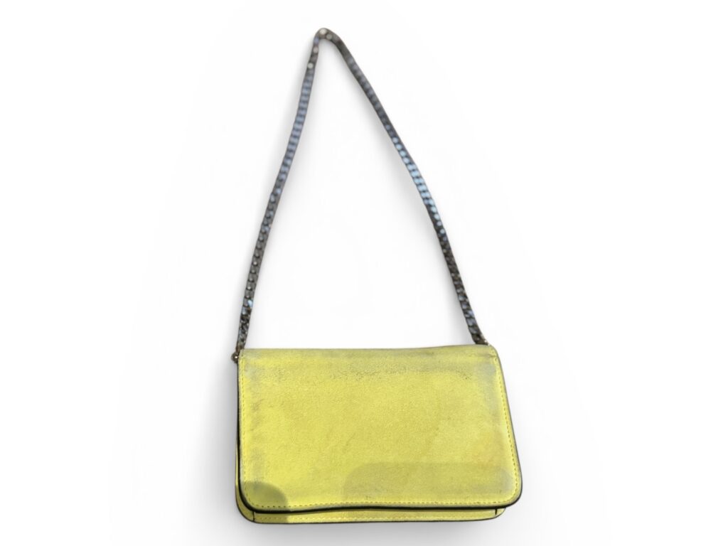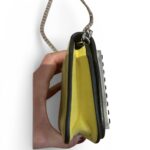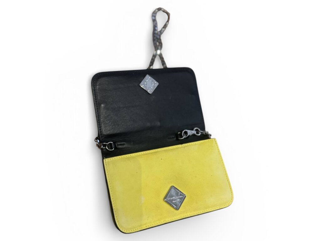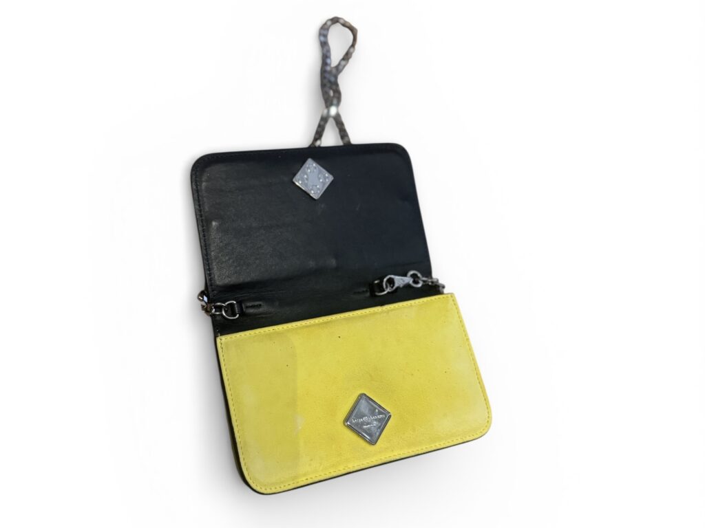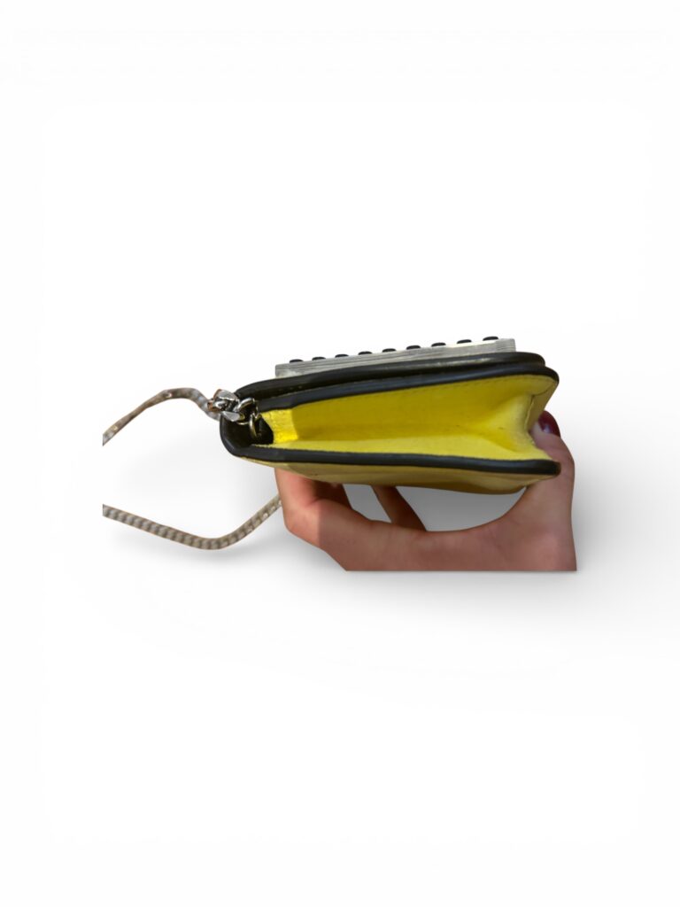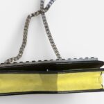 Confectionné en cuir jaune et noir, chaîne métallique argentée.