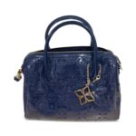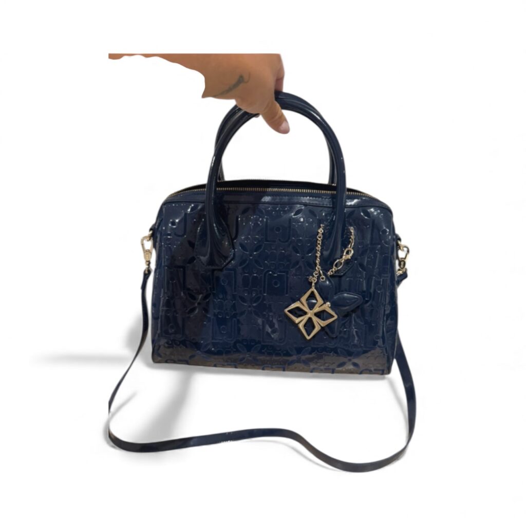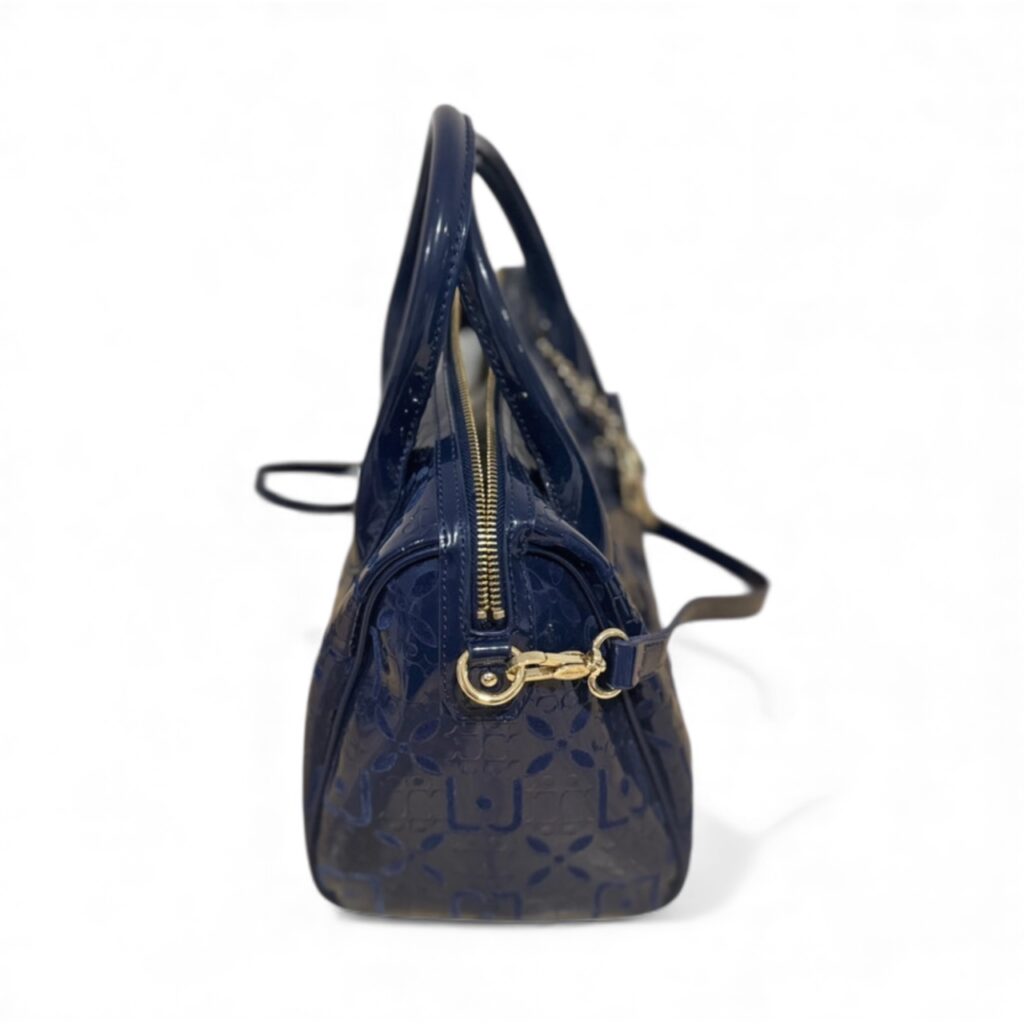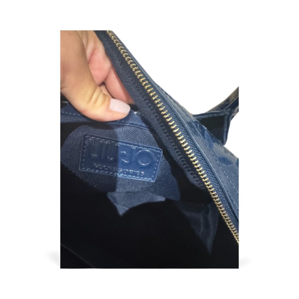 Magnifique sac Liu Jo en simili cuir verni bleu marine, embossé du monogramme iconique de la marque.