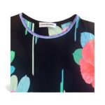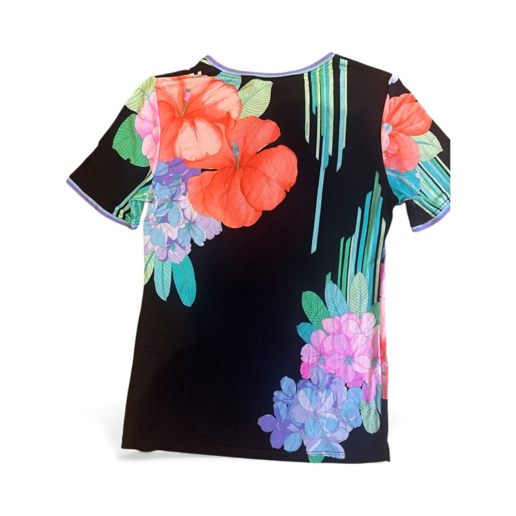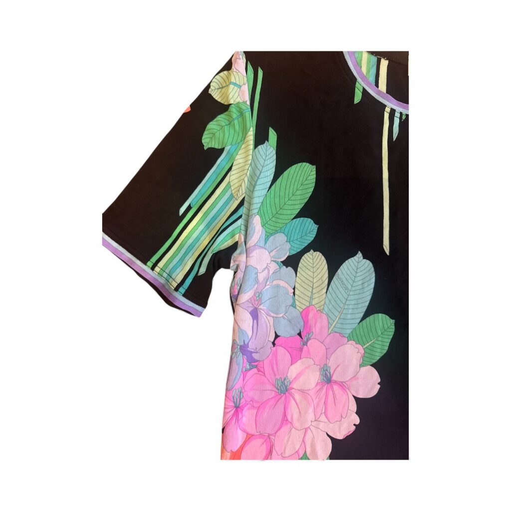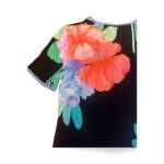 Sublime top Leonard Paris, signature de la maison avec son imprimé floral éclatant sur fond noir. Coupe droite, col rond, manches courtes, finition bordée de liserés colorés. Matière fluide, agréable et typique de la marque.