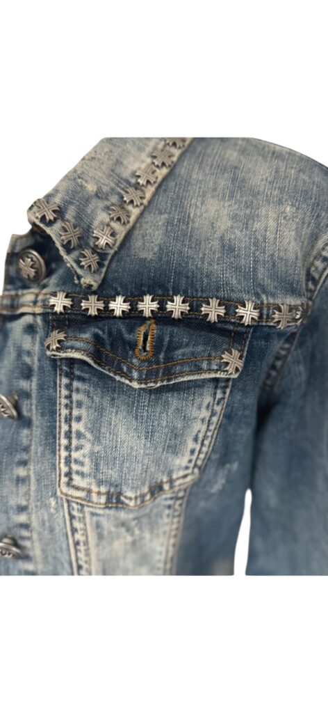On reconnaît immédiatement l’ADN de la maison avec ses détails de croix métalliques emblématiques au niveau du col, des poches et de l’empiècement dos. Une veste au délavage travaillé, à la fois tendance et intemporelle, facile à porter au quotidien comme sur une tenue plus pointue.